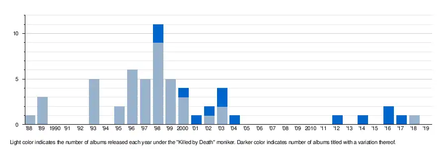 6. ^ "Killed By Death Compilations". Maximum Rocknroll. No. 171. August 1997. Retrieved 9 May 2022. The past has seen a glut of LPs with the Killed by Death title ... I've run into a number of people who are understandably confused about which, if any, volumes to pick up. Allow me to get you started on the right foot ... the series began around 1988 at the hands of a crazed Swedish transplant to the States. Imagine one Swede with one Motorhead song title doing so much for you. Killed By Death #1 documented and exacerbated an obsession with punk singles from '77-'82 that continues to become more compulsive, and that's the way I like it. Uh huh. Since then, no less than eight parties have used the name for compilations that are sometimes as good or better than the originals, sometimes not worth the plastic they're pressed on. The volume numbers were sequential for awhile but have recently become intentionally ridiculous. Incredibly, no volume number overlap has occurred despite multiple parties releasing the LPs over the years.