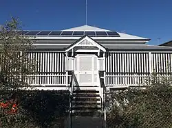 The front verandah has been enclosed with timber louvres and the original dowel balustrading is covered by fibrous cement panels. The original square verandah posts with tapered chamfers, have simple capital and astragal embellishments, and are visible in the front facade. Entry to the front verandah is gained via a short flight of later concrete stairs and through a single lattice door. A flying gable above the entry has decorative fretwork fronted by a simple slat infill and bargeboard. The side verandahs have also been enclosed with hinged windows. The formerly exposed face of the eastern gable, now hidden by the side verandah in-fill, has 8-inch (200 mm) deep chamferboards, which may have been recycled from elsewhere in the house.[1]