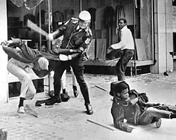Conflicting accounts describe the looting that occurred in tandem with the march on Thursday March 28, 1968 that led to a city-wide curfew and Mayor Loeb calling the Tennessese National Guard. According to multiple witnesses, as Payne emerged from the basement in the Fowler Homes housing development, police officer Leslie Dean Jones pressed the barrel of a sawed-off shotgun into Payne's stomach and fired, killing him.[4] It was determined that Payne was emerging from the housing complex's boiler room when Jones shot him.[5][6] Payne reportedly had his hands up prior to his killing and had asked the officer not to shoot.[4][7] Jones later claimed that Payne was holding a large butcher knife when he emerged from the basement, a statement denied by witnesses to the killing.[4] The Shelby County grand jury did not press charges, and the U.S. Department of Justice declared that there was insufficient evidence to prosecute Jones when investigating him for civil rights abuses.[4][6]