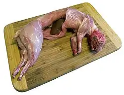 Halāl (Arabic: حلال ḥalāl, 'permissible'), also spelled "hallal" or "halaal", is any object or an action which is permissible to use or engage in, according to Islamic law. The term covers and designates not only food and drink but also all matters of daily life.[21] There are three ways of halal killing: slitting of the throat (dabh), plunging the knife into the dimple over the breast bone (nahr), and killing in some other way ('aqr). The name of God (bismillah) must be said before killing the animal. The killing must be swift and with no prior stunning of the animal being killed.[22] Blood must be drained out of the carcass.[23]