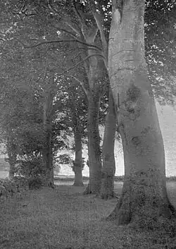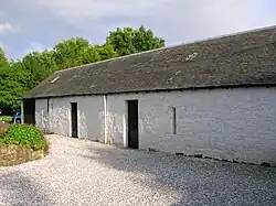 In 1912 the remains of an avenue opening on the Townend and leading circuitously to the old frontage could still be discerned in the field adjoining the main road; Cuthbertson records a few of these beech trees being present in 1945.[51] The entrance off the Mill Vennel by a bridge over the Carmel Water, is said to have been formed when the frontage was changed.[52]