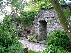 The 1788–91 Eglinton estate plans of holdings in Kilmaurs show an entrance running straight up to The Place from near the bridge over the Carmel Water on the Kilmaurs Road; the formal pleasure gardens are illustrated as a square of three by three equal size squares with paths dividing them up. These gardens lay on the church side of the house, slightly offset towards Tour House.[53] In 1945 the vaulted ruins were being used as stores for agricultural tools and such-like.[51]