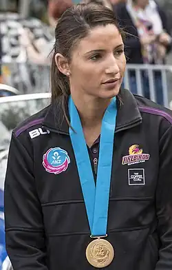 In 2011 and 2012, Ravaillion represented Australia at under-19, under-21 and Fast5 levels.[18][19][20][49] In January 2013, aged 19, she made her senior debut during an away series against England. She replaced injured captain, Natalie von Bertouch. This saw Ravaillion make her senior test debut before making her top level league debut. Her first game for Queensland Firebirds came two months after her test debut.[1][22][24][26][50][51] Ravaillion was subsequently a member of the Australia teams that won the gold medals at the 2014 Commonwealth Games and the 2015 Netball World Cup and the silver medal at the 2018 Commonwealth Games.[1][22]