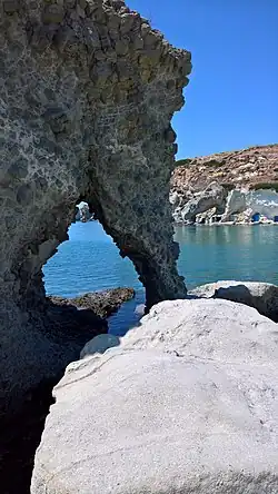 Kimolos, Milos and the smaller islands that surround them belong to the Aegean volcanic arc and consist mainly of acidic volcanic rocks. In some places, the pre-volcanic bedrock can be observed. Large areas of Kimolos are covered by tuffs and the volcanic activity can be obvious from the hot springs, existence of a notable geothermal field, the characteristic landscape and strange landforms. The island is also rich in minerals of the silica group and in significant industrial minerals.