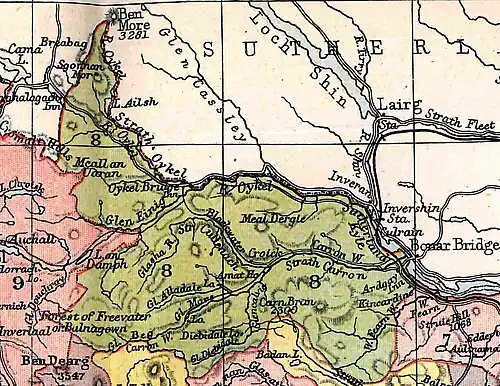 Through the centre flows the river Carron and its tributaries, until it flows into the kyle of Sutherland just above Bonar Bridge.[4]