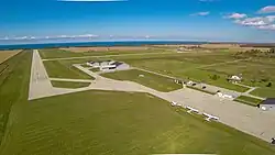 Aerial photo of runways, ramps, taxiways, apron, hangars and terminal building at CYKM