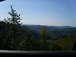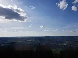 From the Kindelsberg tower, you can see the villages around the mountain in the center of Kreuztal. You can also see the Siegerland region with the Westerwald (south) and the Rothaar Mountains (northeast) beyond and across to the Ebbe Mountains (northwest). In good weather, you can see as far as the Sieben Mountains (west-southwest) near Bonn, about 40 miles (65 km) to the southwest.