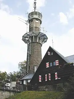 The Kindelsberg tower was topped by an iron "lantern" and surrounded at the base by a covered walkway with a small lounge. In 1953,[7] to better serve the hikers, a log cabin made of spruce trunks with a quarry stone base was erected in place of a small shelter. In 1968,[7] when it was no longer able to meet the demands of the many visitors, it was considerably enlarged to become a large mountain inn "with an architecture based on the log cabin style of the Alpine countries". The new building was completed in 1971 with the second phase of construction. A kitchen extension was built in 1990 and a terrace extension in 1996.[7] The building is no longer just a hiker's hostel, but a respectable guesthouse for hikers and tourists - the Kindelsberg Guesthouse.[9]
