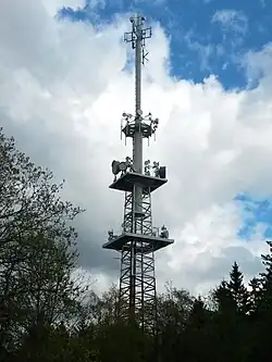 The Kindelsberg transmitter tower of the West German Broadcasting Service (WDR) is located only 60 meters northeast of the Kindelsberg summit. It was built in the 1990s and served as an important transmitter for analog television for a long time. The FM radio station WDR 5, whose frequency (97.6 MHz) was previously transferred to this tower from the Siegen-Giersberg transmitter in the south-southeast, was broadcast from there; among others, 1LIVE, WDR2, WDR3 and WDR4 are broadcast from there. On February 11, 2021, the frequency was moved back to the Giersberg transmitter for cost reasons.[11]