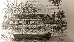 Henry Morton Stanley came upon "this remarkable town" on 5 Dec. 1876, describing it as "remarkably long" with a "broad street, thirty feet wide, and two miles in length" and "behind the village were the banana and the palm groves."[3]: Vol.Two, 132–133