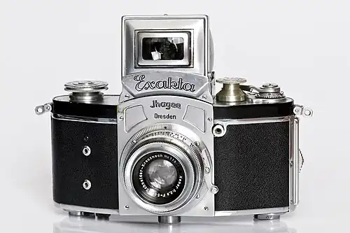 The Kine Exakta was the first 35mm single-lens reflex (SLR) still camera in regular production. It was presented by Ihagee Kamerawerk Steenbergen GmbH, Dresden at the Leipziger Frühjahrsmesse in March 1936.[1] The Exakta name had already been used by Ihagee on a roll film rangefinder RF camera line since 1933, among these the Vest Pocket Exakta Model B from which the Kine Exakta inherited its general layout and appearance. The word Kine (cine, cinema, movie film) never appeared on the camera itself, only in the instruction manuals and advertising to distinguish it from the roll film variants. Several of its features constituted the foundation for the majority of 35mm SLR cameras produced ever since, although at this stage in a relatively primitive state.[2]
