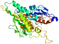 ![]() Crystallographic structure of the human kinesin motor domain depicted as a rainbow colored cartoon (N-terminus = blue, C-terminus = red) complexed with ADP (stick diagram, carbon = white, oxygen = red, nitrogen = blue, phosphorus = orange) and a magnesium ion (grey sphere).[14] | |||||||||