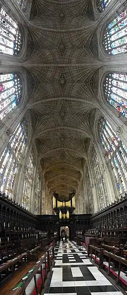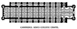 Henry VI planned a university counterpart to Eton College (whose Chapel is very similar, but not on the scale intended by Henry). The King decided the dimensions of the Chapel. Reginald Ely was most likely the architect and worked on the site since 1446.[6] Two years earlier Reginald was charged with sourcing craftsmen for the Chapel's construction.[6] He continued to work on the site until building was interrupted in 1461, having probably designed the elevations.[6] The original plans called for lierne vaulting, and the piers of the choir were built to conform with them.[6] Ultimately, a complex fan vault was constructed instead.[6] Reginald probably designed the window tracery at the extreme east of the church's north side: the east window of the easternmost side chapel, which unlike the Perpendicular style of the others is in curvilinear Gothic style.[6] The priest and later bishop Nicholas Close (or Cloos) was recorded as the "surveyor", having been the curate of St John Zachary, a church demolished to make way for the Chapel.[7][8][9]