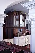 Music has long been an important part of King's Chapel, which acquired its first organ in 1713, bequeathed to the congregation by Puritan minister Thomas Brattle. Other organs that followed were built by Richard Bridge, Hook & Hastings, and Simmons & Willcox. The fifth organ installed in the chapel was a large 1909 E.M. Skinner organ. It had been a gift from Frank E. Peabody in memory of his deceased son Everett.[6] The present organ, the sixth installed in King's Chapel, was built by C.B. Fisk in 1964. It is decorated with miters and carvings from the Bridge organ of 1756, and it is slightly below average in size compared with most mid-1900s European chapel organs.[7] For forty-two years starting in 1958,[8] the eminent American composer Daniel Pinkham was the organist and music director at King's Chapel.[6] He was succeeded by Heinrich Christensen.