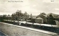 As the need for isolation of patients with infectious diseases became more widely recognised, some temporary wooden pavilions were built on the outskirts of Lochee in 1867 and later on the site of what is now King's Cross for smallpox and typhus patients. Kings Cross, which initially had just two wards, took over their function.[1][3] By 1913 King's Cross had seven wards supplemented by several a variety of ancillary buildings. These included King's Cross Hospital (West), built in 1893 as accommodation for cases of smallpox, with a small unit for cholera patients. These facilities were used intermittently until 1927 when the hospital had address an outbreak of variola minor. This outbreak was severe enough to require an additional ward to be constructed.[1]
