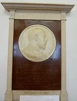 The Princess unveiled the medallion plaque of Edward VII in the vestibule. Carved by Emil Fuchs, it was described as a "most lifelike portrait of the late king." The medallion itself was carved from Carrara marble and fixed to a framed panel of reddish-brown and white-veined rosso antico marble.[2][39] The frame was described as being "of a fine white free stone of a classical design." The inscription on the panel said: "This medallion was unveiled, and this building formally opened, by Her Royal Highness Princess Henry of Battenburg on behalf of Her Most Gracious Majesty Queen Alexandra by whose gracious permission it was named The King Edward VII Memorial Hall, July 10th 1913." F.W.J. Palmer presented her with a gold key; she opened a door to the Hall and declared it open.[2] After the ceremony the schoolchildren were marched back to their schools where they enjoyed a free tea and a sports day.[2]