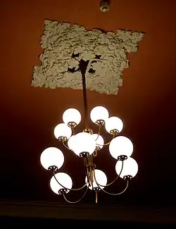 At a size of 136 feet (41 m) long, 60 feet (18 m) wide and 20 feet (6.1 m) high, the Hall provided space for seating 1,500.[6] In 1913 the ceiling was plastered with a cornice and a "deep frieze of a delicate tint, and a picture moulding" around three sides of the Hall; this has now been replaced.[2] The four main reinforced concrete roof beams create five ceiling bays, and in each bay are three plaster centrepieces representing vines and grapes. These are ventilator-covers. The middle one of each three originally carried copper bronze electroliers with chains and Holophane reflectors.[2] (Today, more numerous and bigger lights are fixed there.) The walls were originally largely of glass and painted in eau de nil or pale green, with a darker shade on the dado.[2][3] The special dance floor was rock maple over concrete, and the acoustics were said to be "perfect".[2][3] There was a further tiered seating area on the roof for 1,100 deckchairs facing the cast iron bandstand and linking the roof with the Downs.[3][6] The roof was "illuminated by five electric light standards, and the columns, the upper ornamental part of the bandstand, and the ribs of the bandstand roof [were] picked out with fairylights."[2] The box office in the vestibule was "artistically designed . . . of brick faced with plaster in the Georgian style."[2] The marble plaque on its front was carved by Emil Fuchs who had designed the King Edward VII Coronation Medal.[35] The old tongue-and-groove wood flooring of the vestibule was now replaced with terrazzo paving, with the town crest decorating the area in front of the kiosk (today this is covered over, or possibly removed). Over the Hall's exit doors (now removed) and over the kiosk were bullseye glass circles.[2][3]
