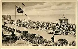In 1913 the Pavilion was developed as a memorial to the late King Edward VII. The architect was again the council surveyor F.W.J. Palmer who presented his plans in April 1911. The council applied to the Local Government Board (LGB) for a loan,[33] and the work cost £6,000: £5,000 for the excavation and construction; £1,000 for furnishings. £5,956 was received from the LGB in August 1912.[2] The builders were Hardy & Co. of Woking whose tender of £5,578 on 16 September 1912 was accepted for the erection work, and one of the contractors was electricity company Hunt & Sons of Charles Street, Herne Bay, who ran a cable underground from their works, beneath Canterbury Road and through the cliff.[2][6] The entertainers Rouse, Way & Wilson made an advance investment of £700 in the theatre, the profits to be shared by the council. The excavation commenced in October 1912, and "many thousands of yards of London Clay" were removed to extend the building into the cliff.[2] The 1904 building was incorporated and extended as a theatre, concert hall and dance hall below the Downs on East Cliff, and the existing small auditorium became the vestibule for the new hall. The 1913 Hall was designed to accommodate 1,500, with 1,100 in the open-air theatre on the roof.[2] The high price for this build partly reflects the large excavation into the cliff for the Hall, and the early use of ferro-concrete, with steel bars made by the Spiral Bond Bar Company, who had patented the process that they used in the same year.[6][34] The building was specially designed not to interfere with the view from houses on Beacon Hill to the south; nevertheless a 60 feet (18 m) flagstaff was erected between the Hall and the Beacon Hill estate.[2]