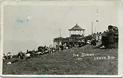 "The erection of a pavilion on the east cliff for the use of residents and visitors. Its accommodation . . . should include a roofed in verandah shelter facing the sea, a large reading room intended to be supplied with newspapers, ladies' and gentlemens' lavatories, rooms for attendants, and drinking fountains . . . Band performances might at the discretion of the Council be permitted in the public hall, but no beach minstrels, or conjurors, or variety entertainments . . . The Urban Council should instruct their surveyor to prepare plans and specifications for this pavilion to cost £2,000, the plans to be so arranged as not to interfere with the view of residences then and thereafter to be erected on Beacon Hill."[12]