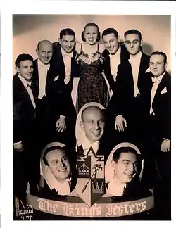 The King's Jesters began as a comic vocal trio that also played instruments along with an accompanist. It comprised John Ravencroft - sax and clarinet, Francis "Fritz" Bastow - banjo and guitar, George Howard - drums and vibraphone, along with Ray McDermott - piano, accordion, and arranger. They were hired by Paul Whiteman to replace The Rhythm Boys and sang with him from 1930 to 1931. When they left Whiteman, they added vocalist Marjorie Whitney (whom they called their queen). These five were the core of the King's Jesters.[1] The group most often appeared on Billboard's Music Popularity Charts in the '40s.[2][3][4][5][6]