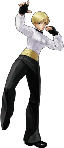 Debuting in Art of Fighting as the only playable female character, King has since become a mainstay of The King of Fighters series, first appearing on the Women Fighters team in The King of Fighters '94, originally labeled as the England Team. King is French, though, and fights with a form of Muay Thai kickboxing, along with powerful special moves such as her projectile move Venom Strike (ヴェノムストライク). Despite being the first female fighter in Art of Fighting, her initial appearance was designed so that her gender was not clear.[3] This includes her clothes, which are manly, while the earrings were made feminine. King was voiced by Harumi Ikoma.[4]