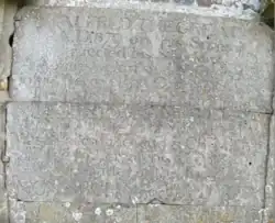 Around the Stourhead estate are several inscriptions. The plaque of the inscription is in poor condition and needs restoration. It was drafted in 1762 and installed in 1772.[19] The stone tablet above the door on the east face of the tower reads: