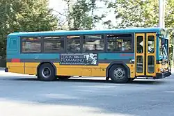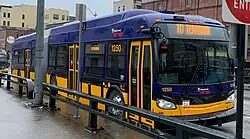 Metro's buses are painted in various color schemes that are assigned based on their type; the last major change was in 2004. The buses generally have their bottom half painted in yellow with a different color on top, including purple for electric trolleybuses[36] and red for RapidRide buses. It is intended to be replaced beginning in 2025 with the introduction of battery electric buses that are colored yellow and light blue for conventional coaches or red and purple for RapidRide.[37][38]