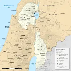 After the death of Herod the Great, Augustus confirmed the testament of the dead king by making Antipas tetrarch of Galilee and Perea, a region he ruled for 42 years.[18] The two territories were separated by the region of the Decapolis, with Galilee to the north and Perea to the south. Threats to stability in both areas would have been clear to Antipas when he took office. While he had been making his case to Augustus in Rome, dissidents had attacked the palace of Sepphoris in Galilee, seizing money as well as weapons which they used to terrorize the area.[19] In a counterattack ordered by Quinctilius Varus, Roman governor of Syria, Sepphoris was destroyed by fire and its inhabitants sold as slaves.[20] Perea, meanwhile, bordered on the Kingdom of Nabatea, which had long had uneasy relations with Romans and Jews.[21]