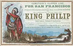 King Philip was built in Alna, Maine in 1856.[4] Seven years later she was being advertised as "a strictly first-class clipper ship with quick dispatch" and "well-known to shippers as one of the best and most reliable vessels in the California trade. Stands A-1 for seven years". With a wooden hull and three masts, she was a medium-sized clipper measuring 1,194 tons.[1] She was named for Metacomet (who was known to the English as "King Philip"), a war chief or sachem of the Wampanoag Indians. Metacomet was the Wampanoag's leader in King Philip's War.[5][6]