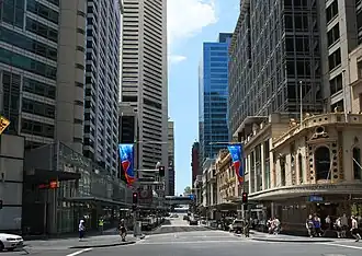 King Street is a street in the Sydney central business district in New South Wales, Australia. It stretches from King Street Wharf and Lime Street near Darling Harbour in the west, to Queens Square at St James railway station in the east.[1]
