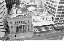 The building at 100 King William Street[10] was also designed by Williams & Good.[11] It was constructed in 1848, comprising a hotel and concert hall commissioned by proprietor George White and designed by George Strickland Kingston. White's Adelaide Assembly and Concert Room opened on 26 June 1856. It was refitted as Garner's Theatre (proprietor Alfred Garner) in 1886, with decorations by George Gordon. It was taken over by new proprietor Tommy Hudson, and renamed Hudson's Bijou in 1892. In 1900, Harry Rickards purchased the building and reopened it as the Tivoli Theatre,[b] which operated briefly as a cinema, called the Star Theatre.[10]