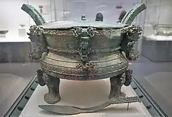After some military successes, King Zhuang attempted to usurp King Ding of Zhou. According to a well-known story, probably an invention of the Warring States period, he asked a messenger from Zhou about the weight of the legendary Nine Tripod Cauldrons which Zhou possessed, a euphemism for seeking ultimate power in China, but was rebuffed. This incident gave rise to the chengyu "to enquire about ding in the central plains", i.e. to have great ambitions (問鼎中原; 问鼎中原; wèn dǐng zhōngyuán).[2]