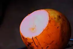 King coconut (Cocos nucifera var aurantiaca) is a variety of coconut, native to Sri Lanka, where it is known as Thæmbili (Sinhala: තැඹිලි)also found in India and Indonesia.[1] It has less sugar content than other coconuts. There are several sub-varieties of the king coconut, the most common being the "red dwarf" (kaha thæmbili, commonly referred to as gon thæmbili). The other variety is "Ran Thæmbili",[2] a smaller variety containing about forty nuts in a bunch. The king coconut tree is shorter than coconut trees, and is commonly found growing wild in many areas of the country.[3]