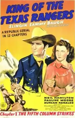 King of the Texas Rangers (1941) is a Republic film serial.[2] Set in the years prior to America entering World War II, the plot is slightly anachronistic in that the serial features a mix of period western and modern elements, which was not unknown in the B-Western films also produced by Republic.[3] Although the serial's plot involves cowboys battling Axis agents in Texas, Nazis are never named as such, but their presence is strongly implied within the serial.[4][a]