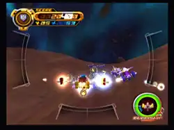 In response to criticism, the "Gummi Ship" feature of the first game was re-imagined to be "more enjoyable". Although retaining its basic purpose of travel, the system was completely redone to resemble a combination of rail shooter and "Disney theme park ride".[10] In the world map, the player now controls the Gummi Ship from a top-down view to fly to the world they wish to enter. Worlds are no longer open from the beginning—the player must unlock the routes to them by entering a new level, controlling the ship from a third-person point of view, and battling enemy ships.[13] After the route is opened, travel to the world is unimpeded, unless it is blocked again due to a plot-related event. The player may also gain new Gummi Ships from completing routes, which is also a new feature.