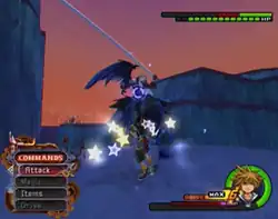 Combat in Kingdom Hearts II takes place in real-time and involves hack and slash elements with button presses which initiate attacks by the on-screen character. A role-playing game menu on the screen's bottom left, similar to those found in Final Fantasy games, provides other combat options, such as using magic or items, summoning beings to assist in battle, or executing combination attacks with other party members.[13] A new feature is the "Reaction Command", special enemy-specific attacks that are triggered when the player presses the triangle button at the correct time during battle.[14] Reaction Commands can be used to defeat regular enemies or avoid damage, and are sometimes necessary to complete a boss battle.[12] In addition to the main character, two party members are usually present who also participate in combat.[9] Although these characters are computer-controlled, the player is allowed to customize their behavior to a certain extent through the menu screen, such as attacking the same enemy Sora targets.