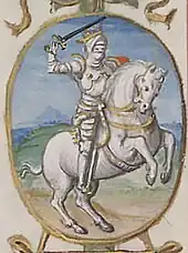 Asturias also has examples of the king in the mountain myth. According to the tradition, it is still today possible to see king Fruela walking around the Jardín de los Reyes Caudillos[43] (a part of the Oviedo Cathedral), and it is said that his grandson, the famous cavalier Bernardo del Carpio, sleeps in a cave in the Asturian mountains. The story tells that one day a peasant went into a certain cave to retrieve his lost cow and heard a strong voice who declared to be Bernardo del Carpio, victor over the Franks in Roncevaux.[44] After saying he had lived alone for centuries in that cave, he told the peasant: "Give me your hand, so that I can see how strong are men today". The shepherd, scared, gave him the horn of the cow, which, when seized by the giant man, was immediately broken. The poor villager ran away terrified, but not without hearing Bernardo say: "Current men are not like those who helped me to kill Frenchmen in Roncevaux".[45][46]