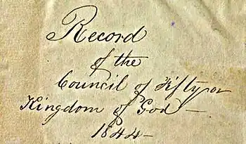 - ^ "Administrative Records, Council of Fifty, Minutes, March 1844–January 1846". The Church Historian’s Press. Church History Department of The Church of Jesus Christ of Latter-day Saints. Retrieved 10 December 2017.