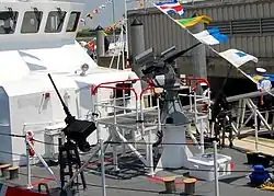 One of the first Maritime Force Protection Units was established by the United States Coast Guard (USCG) at Kings Bay. The Maritime Force Protection Unit provides escort protection for the submarines as they transit on the surface, to and from their homeports.[6][7][8][9][10][11][12] The unit includes some smaller vessels, and two Marine Protector class cutters, the USCGC Sea Dragon and the USCGC Sea Dog. The Sea Dragon and Sea Dog, and two other cutters, the USCGC Sea Devil and USCGC Sea Fox, although crewed by sailors from the Coast Guard, were ordered (and paid for) by the Navy. For protecting submarines the Navy requested a slightly modified design, which added gyrostabilized machine gun, with advanced optics, which was fired under remote control from the ship's bridge. The gyrostabilized gun's greater long-range accuracy made it more appropriate for intercepting speedboats laden with a suicide bomb.