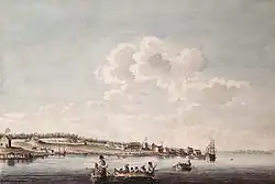 In 1783, Frederick Haldimand, governor of the Province of Quebec directed Major Samuel Holland, Surveyor-General of Quebec, to lay out a settlement for displaced British colonists, or Loyalists, who were fleeing north because of the American Revolutionary War and "minutely examine the situation and site of the Post formerly occupied by the French, and the land and country adjacent". Haldimand had originally considered the site as a possible location to settle loyal Mohawks.[26] The survey would also determine whether Cataraqui was suitable as a navy base since nearby Carleton Island on which a British navy base was located had been ceded to the Americans after the war. Holland's report about the old French post mentioned "every part surpassed the favorable idea I had formed of it", that it had "advantageous Situations" and that "the harbour is in every respect Good and most conveniently situated to command Lake Ontario".[26] Major John Ross, commanding officer of the King's Royal Regiment of New York at Oswego partly rebuilt Fort Frontenac in 1783. As commander, he played a significant role in establishing the Cataraqui settlement.