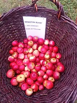 The Kingston Black is classed as a "bittersharp" in the standard classification of cider apples, being high in both tannin and acid.[2] The tree is strongly biennial in fruiting, and can be prone to common apple diseases. Its fruit is small, round in shape, yellow skinned with red streaks on the shade side of the fruit or dark red with dark purple streaks on the sunward side, and patches of grey russetting.[5]