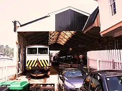 The southern end of the platform and tracks is covered by a rare wooden 100-foot (30 m)[1] train shed, with a more conventional canopy extending further along the platform. The entrance to the station opens onto the main platform within the train shed; trains stop further along the platform to the right to allow the locomotive to run around the train using the crossover at this end of the platform track. The bay platform does not have a locomotive release road and so is only used for occasional departures that have been shunted onto this line to free up the main platform for a second train.