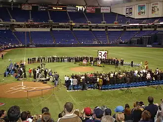 The Twins retired Puckett's number 34 in 1997.[39] In 2001 balloting, he was elected to the Baseball Hall of Fame in his first year of eligibility. In 1999, he ranked Number 86 on The Sporting News list of the 100 Greatest Baseball Players.[40]