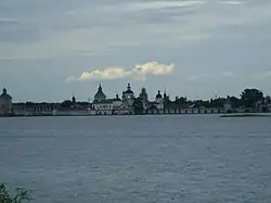 In the 13th century, the territory on which Kirillov now stands was a part of the Principality of Beloozero, which was taken over by the Grand Duchy of Moscow in the 14th century. In 1397, St. Cyril of White Lake, a monk and a disciple of St. Sergius of Radonezh, founded the Kirillo-Belozersky Monastery on the shore of Lake Siverskoye.[3] A monastic sloboda, from which the town later grew, developed around the monastery.[3] The monastery was subordinate to Archbishops of Rostov. In the 15th–17th centuries, the monastery developed into one of the most influential monasteries in Russia.[3] It also helped that the Sheksna River was one of the most heavily used waterways connecting central and northern Russia. At some point, the monastery was the second biggest landowner after the Trinity Lavra of St. Sergius. Vasili III of Russia, the Grand Prince of Moscow, and Ivan the Terrible, the Tsar, visited the monastery on several occasions.