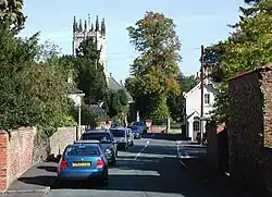 The village skirts the foothills of the Yorkshire Wolds to the west, and rises from around 10 to 40 metres (35–130 ft) above sea level east to west. Housing stock is affluent, much of it detached or semi detached, with large back gardens; street layouts are irregular, curved, with no main roads passing through the village.[3] Much of the housing development is to the south-east of the original village centre, and church.[3][4] An area of Kirk Ella including the church, Church Lane, and parts of Packman Lane and Godmans Lane has been designated a conservation area (since 1974), mainly due to its interesting and varied housing stock. The large gardens in much of the village contribute to a wide variety of native and non-native trees and bushes, and thriving wildlife.[5]