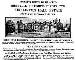The Grade II listed Kirklinton Hall outside the village has been a ruin which lay derelict for 40 years. The hall was purchased by the Palmer family in 2022 and is being lovingly restored[5] An advertisement for the hall before its decay is shown on the left.