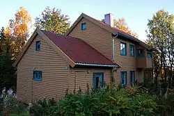 It was built as a demonstration of a light wooden platform construction. It was imperative during the reconstruction effort in the aftermath of World War II to use as few and light materials as possible. Once completed the house was open to the general public several Sundays on a row. It is a relatively small and simple house with two floors and an attic. At the northern end is a one story extension containing storage rooms. Brown corrugated fibre cement sheeting covers the two roofs and the wooden cladding is ochre with blue window surrounds and frames. To the east the house has a smaller extension with large windows and exit to the garden as well as two other characteristic bay windows. Kirsten Sand lived in the house until 1994. In 2017 this house was declared a protected landmark by the Tromsø municipality.[7]