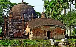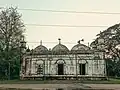It is an attractive building at Egarosindur may be dated sometime around 1680 AD. The mosque stands at the back of a slightly raised platform, which is enclosed by a low wall with a gateway consists of an oblong structure with do-chala roof. The mosque proper is a square structure, 5.79 m (19.0 ft) a side in the inside, and is emphasized with octagonal towers on the four exteriors angles. All these towers shooting high above the roof and terminating in solid kiosks with cupolas, were originally crowned with kalasa finials, still intact in the southern one. The western wall accommodates inside three mihrab –the central one semi –octagonal and the side ones rectangular. The central doorway and central mihrab are larger than their flanking counterparts. The mosque has four axially projected frontones, each corresponding to the centrally located doorways and the central mihrab. The parapets and cornices are horizontal in the usual Mughal fashion.