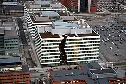 Kista is the largest corporate area in Sweden and important to the national economy.[1] The construction of the industrial section of Kista began in the 1970s with companies such as SRA (Svenska Radioaktiebolaget, now a part of Ericsson), RIFA AB (later Ericsson Components AB, and later still Ericsson Microelectronics AB, and now Infineon Technologies), and IBM Svenska AB (the Swedish branch of IBM). Ericsson has had its headquarters in Kista since 2003.[7] Cellmax is another local company founded and headquartered in Kista.
