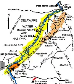 West of the Kittatinny Mountain, at the northwestern end is the Port Jervis trough, also called the Minisink Valley. Next to the mountain on the western side is the Flatbrook Valley or Walpack Valley which runs from Steam Mill to Flatbrookville. From the Delaware Water Gap to the New York line is 40 miles (64 km) but the ridges continues into New York State where it is known as the Shawangunk Mountains. The ridge continues to nearly Kingston, New York.
